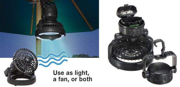 Конструкция беспроводного светильника-вентилятора Happy Camper очень удобна в его использовании: вы можете подвесить его на крючок, поставить под различным углом или носить в руках, если вам нужен переносной источник света. Прибор работает от стандартных алкаиновых батареек и очень экономно расходует их заряд.