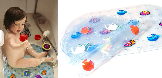 Красивый коврик BATH MAT, выполненный из прозрачного винила и украшенный яркими изображениями экзотических рыбок, не только развеселит малыша в ванной или душе, но и убережет его от риска поскользнуться и получить травму.