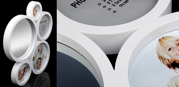 В составной фоторамке MFF6606 можно разместить четыре снимка разного размера, при этом стоит использовать планетарную концепцию дизайна, поместив в рамку самого большого диаметра наиболее важную по содержанию фотографию, а остальные рамки станут ее сателлитами.
